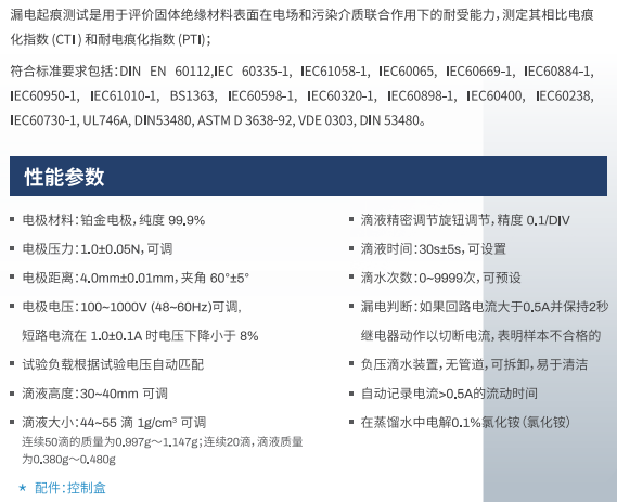 漏電起痕測試是用于評價固體絕緣材料表面在電場和污染介質(zhì)聯(lián)合作用下